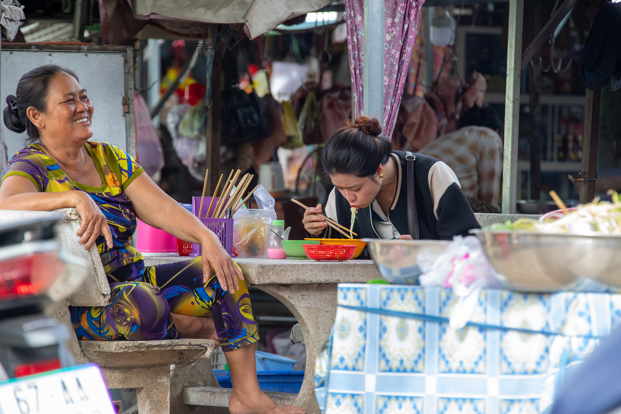 (위) 이 처자는 엄마 가게에 와서 아침 쌀국수 먹느라 바쁘네요.